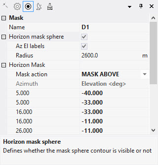 The horizon mask can be visualized by activating the Horizon Mask Sphere in the properties pane. Azimuth and Elevation labels can also be activated, as well as the radius of the representation. The colors represent what side of the horizon mask is in visibility (GREEN) and which one is masked (RED).