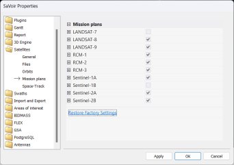 SaVoir configuration for mission plans is accessible in Edit / Properties / Satellites / Mission plans.